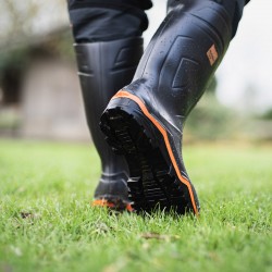 La RUBBER LINE est fabriquée à partir d’un revêtement en Solithane® qui offre légèreté, souplesse et étanchéité. Quant à la semelle en caoutchouc nitrile SBR, elle assure adhérence et résistance optimales. L’embout XL en composite protège contre les chocs, et la semelle intérieure antibactérienne thermoformée, combinée à l’amortisseur d’absorption des chocs, assurent un confort constant. Enfin, pour plus de confort et de stabilité, elle est dotée d’un système anti-perforation, d’un renfort au cambrion, de crampons, et d’un ergot de déchaussage.